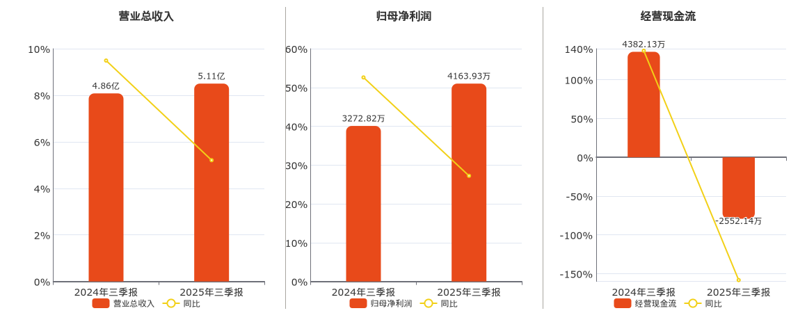 公司营业总收入为5.11亿元。归母净利润为4163.93万元。经营活动现金净流入为-2552.14万元,较去年同报告期经营活动现金净流入减少6934.27万元,同比较去年同期下降158.24%。