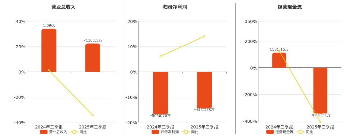 公司营业总收入为7110.15万元。归母净利润为-4331.78万元,较去年同报告期归母净利润增加704.98万元,实现2年连续上涨。经营活动现金净流入为-4701.51万元。