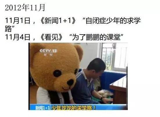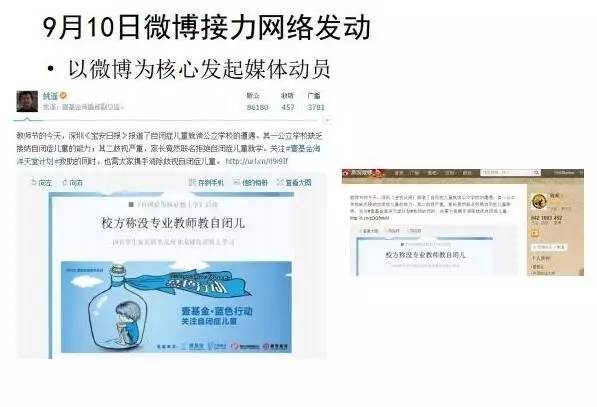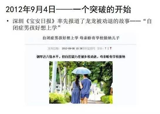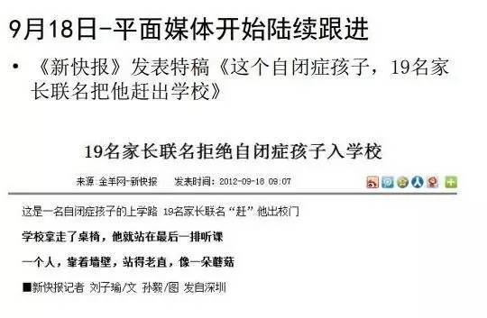 而要打破沉默螺旋的时候,就要找一个个案进行攻坚战突破,这个时间就发生在2012年9月4日深圳宝安区,一个患有自闭症的小孩被劝退学了。这个案例能最大程度凝聚全社会的共识,因为这是一个有一定学习能力的小孩,但是居然被家长联名劝退了,这是一个非常恶劣的事件,会激发很多人对此的关注。