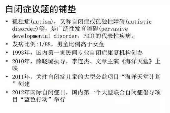 第二个我们做了很多基础信息的梳理整理,在铺垫前期我们对自闭症项目做了非常多的研究,信息要统一精确,咬住精确信息不断地往外输。因为一旦我们连基础定义都飘忽不定的时候,普通公众对于我们问题的看法一定是更加模糊。