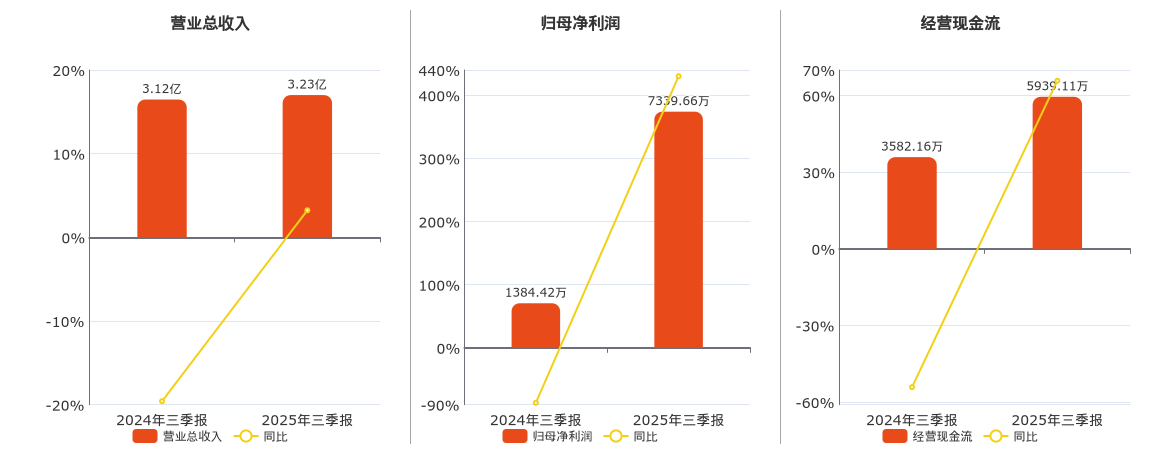 公司营业总收入为3.23亿元。归母净利润为7339.66万元。经营活动现金净流入为5939.11万元。