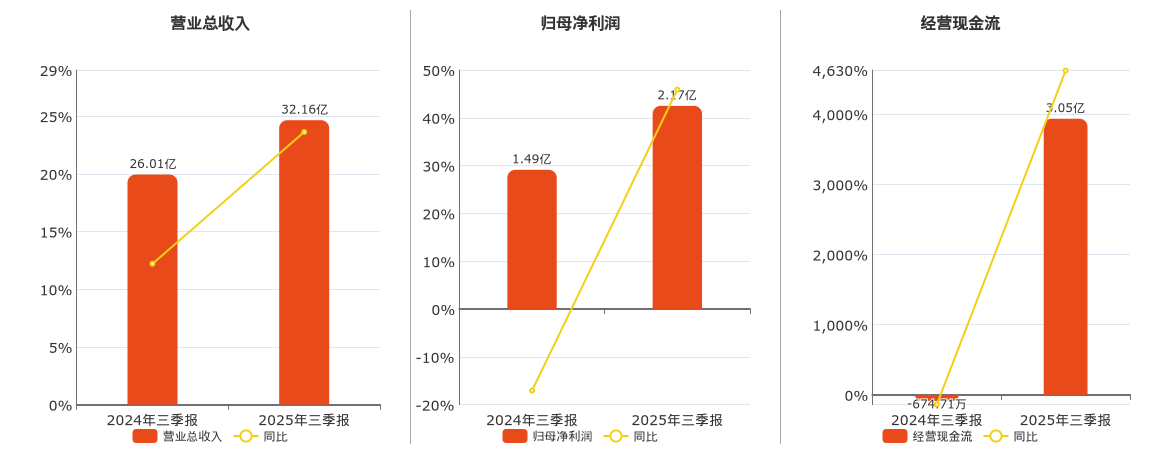 公司营业总收入为32.16亿元,较去年同报告期营业总收入增加6.15亿元,实现5年连续上涨,同比较去年同期上涨23.63%。归母净利润为2.17亿元,较去年同报告期归母净利润增加6837.11万元,同比较去年同期上涨45.90%。经营活动现金净流入为3.05亿元,较去年同报告期经营活动现金净流入增加3.12亿元。