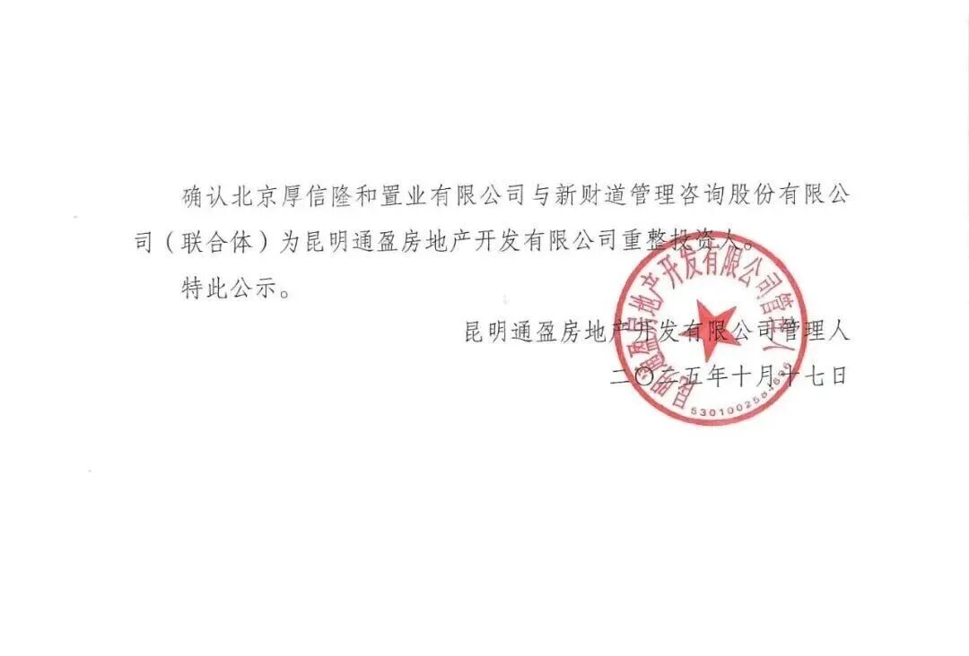 10月17日,昆明通盈房地产开发有限公司管理人正式对外公示,北京厚信隆和置业有限公司与新财道管理咨询股份有限公司(联合体)(以下简称“北京厚信公司联合体”)被确定为通盈地产的重整投资人。