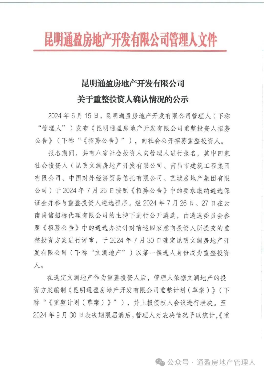 “公示”信息显示,昆明通盈房地产开发有限公司的重整工作自2024年6月15日启动公开招募以来,经历了多次调整与优化。最初,在八家报名社会投资人中,昆明文澜房地产开发有限公司(以下简称“文澜地产”)于2024年7月30日被确定为第一候选重整投资人。然而,在后续《重整计划(草案)》的表决中,该草案未能获得债权人会议通过。