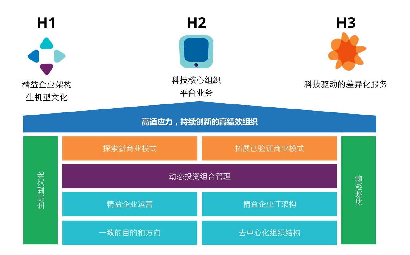 地平线三是尝试和创造有生命力的可选未来业务。这个层面的规划是构建以人工智能、区块链和IoT等先进科技驱动的差异化服务。