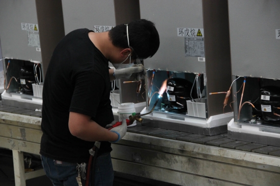 正在生产线上忙活的某冰箱企业工人