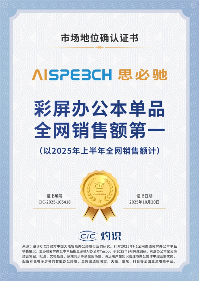 近日,全球知名咨询机构CIC灼识咨询对智能办公终端行业进行深度调研和专项的系统性研究,确认了2025年上半年思必驰AI办公本Turbo稳居彩屏办公本品类全网销售额榜首。