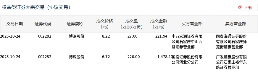 10月24日,博深股份大宗交易成交247万股,成交额1700.34万元,占当日总成交额的25.57%,成交均价6.88元,较市场收盘价7.42元折价7.22%,其中最高成交价8.22元,最低成交价6.72元。