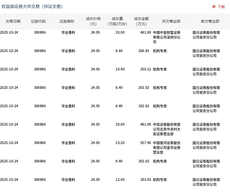 华业香料今日大宗交易折价成交120万股,成交额2886万元