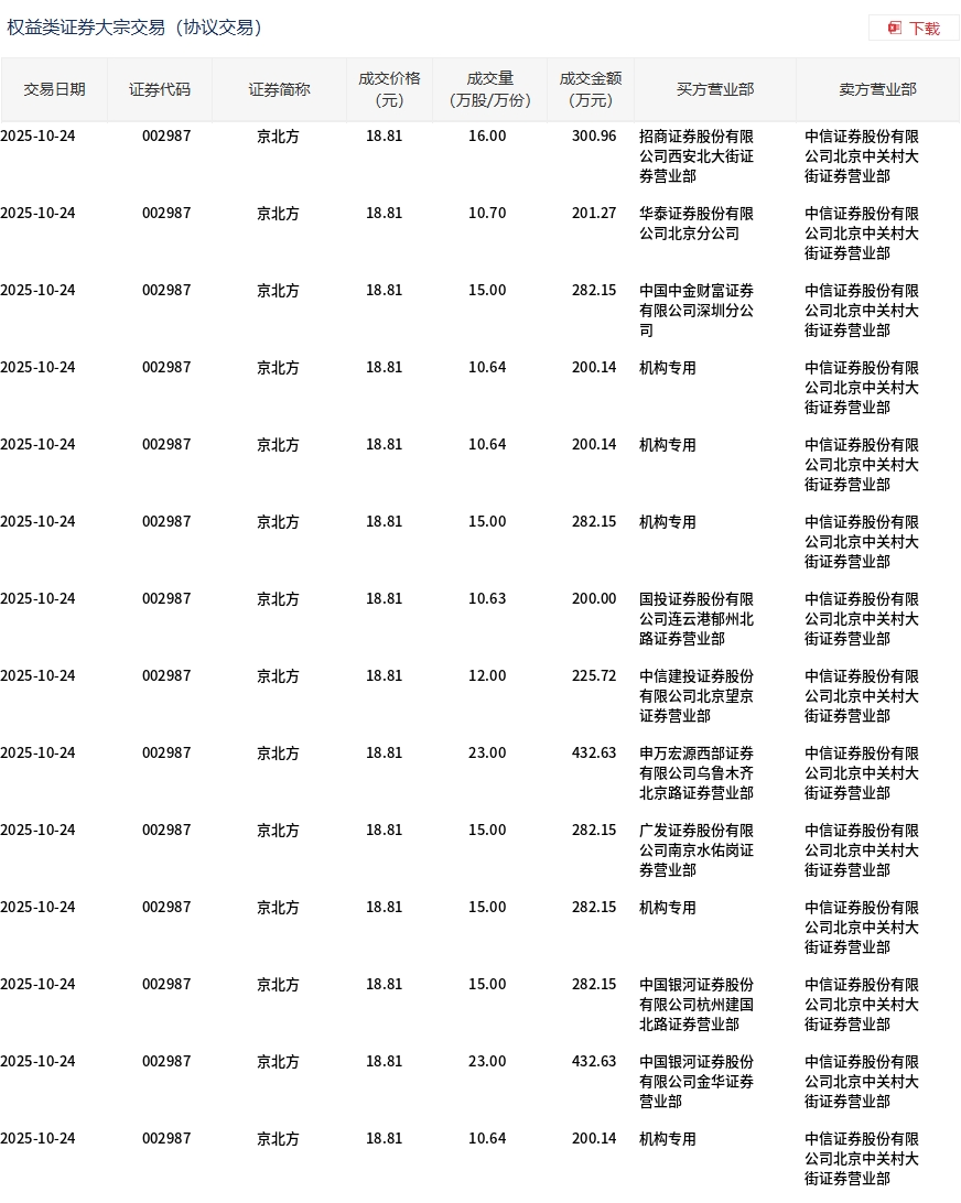 10月24日,京北方大宗交易成交202.25万股,成交额3804.38万元,占当日总成交额的7.03%,成交价18.81元,较市场收盘价21.32元折价11.77%。