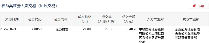东方财富今日大宗交易溢价成交21.5万股,成交额640.7万元