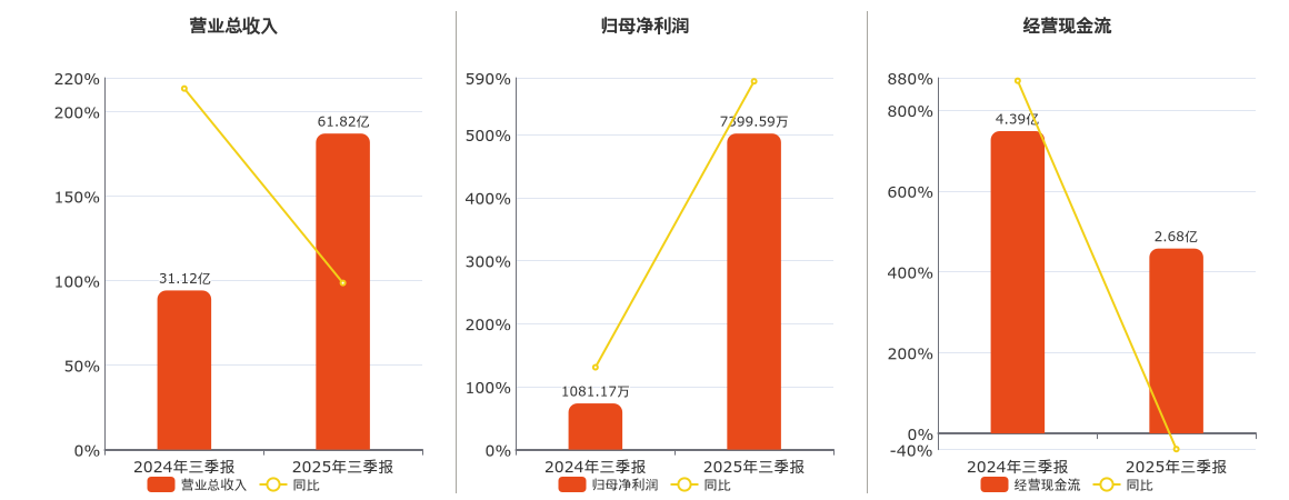 公司营业总收入为61.82亿元。归母净利润为7399.59万元。经营活动现金净流入为2.68亿元,较去年同报告期经营活动现金净流入减少1.70亿元,同比较去年同期下降38.83%。