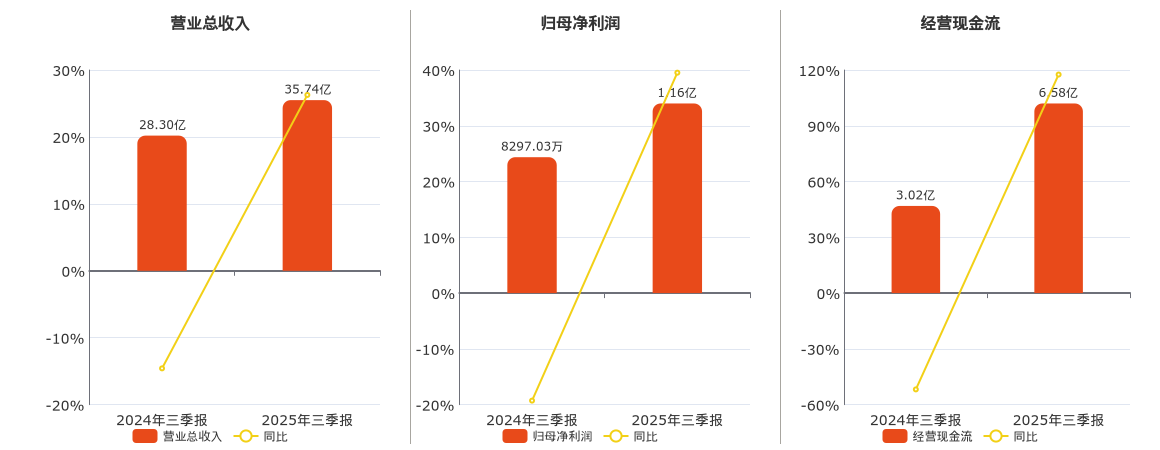 公司营业总收入为35.74亿元。归母净利润为1.16亿元。经营活动现金净流入为6.58亿元。