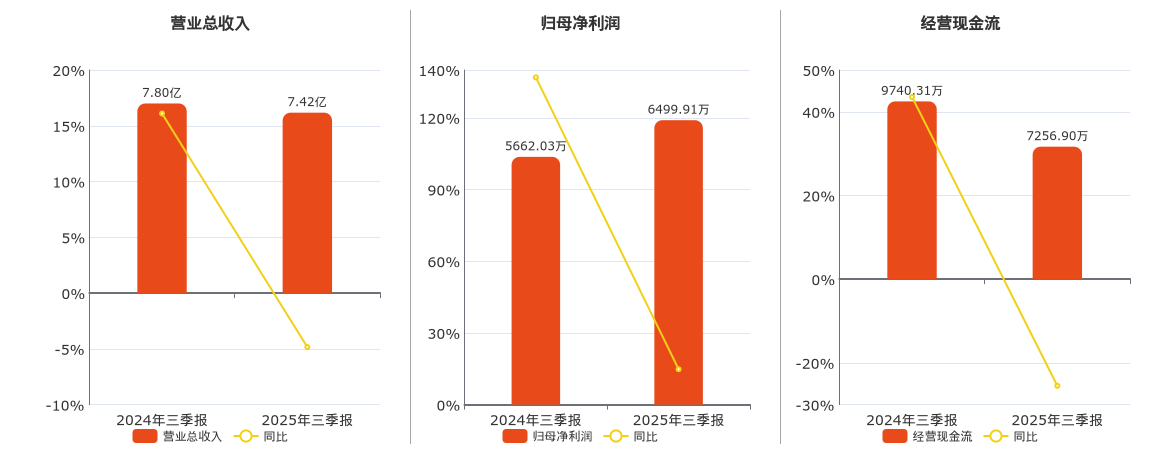 公司营业总收入为7.42亿元,较去年同报告期营业总收入减少3770.13万元,同比较去年同期下降4.84%。归母净利润为6499.91万元。经营活动现金净流入为7256.90万元,较去年同报告期经营活动现金净流入减少2483.40万元,同比较去年同期下降25.50%。
