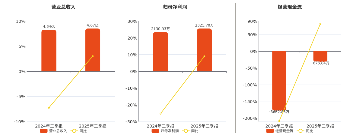 公司营业总收入为4.67亿元。归母净利润为2321.70万元。经营活动现金净流入为-673.84万元。