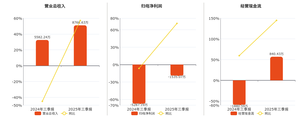 公司营业总收入为8768.63万元。归母净利润为-1535.07万元。经营活动现金净流入为840.43万元。