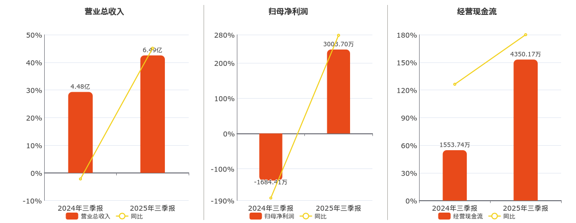 公司营业总收入为6.49亿元,较去年同报告期营业总收入增加2.02亿元,同比较去年同期上涨45.11%。归母净利润为3003.70万元,较去年同报告期归母净利润增加4688.10万元。经营活动现金净流入为4350.17万元,较去年同报告期经营活动现金净流入增加2796.44万元,实现2年连续上涨,同比较去年同期上涨179.98%。