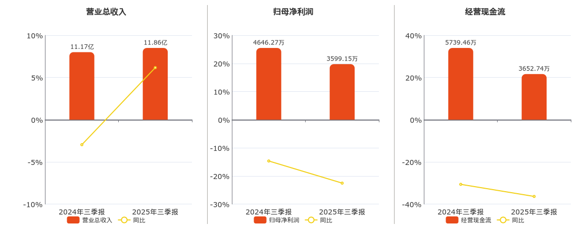公司营业总收入为11.86亿元,较去年同报告期营业总收入增加6896.15万元,同比较去年同期上涨6.17%。归母净利润为3599.15万元,较去年同报告期归母净利润减少1047.13万元,同比较去年同期下降22.54%。经营活动现金净流入为3652.74万元,较去年同报告期经营活动现金净流入减少2086.72万元,同比较去年同期下降36.36%。