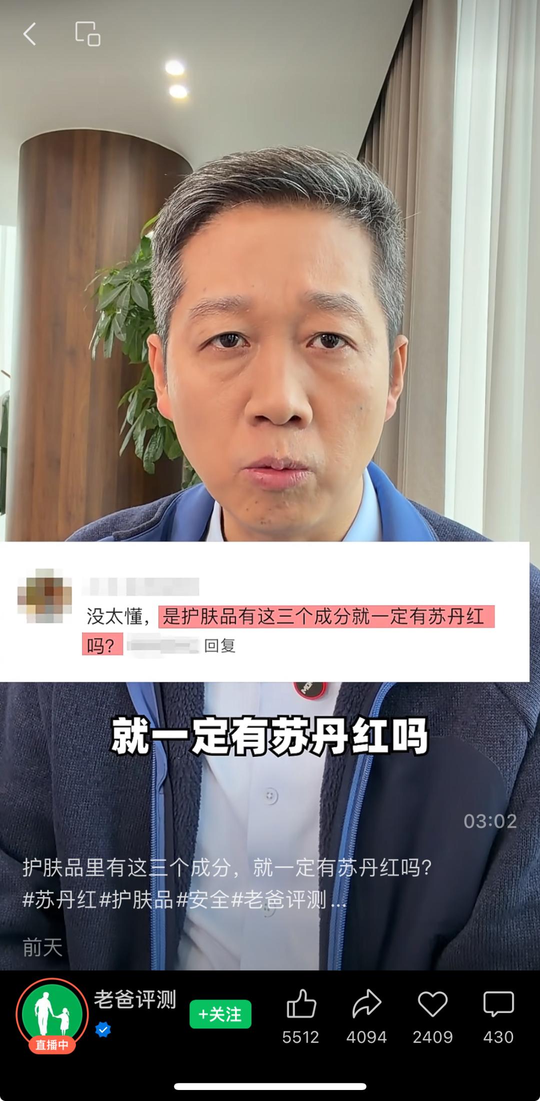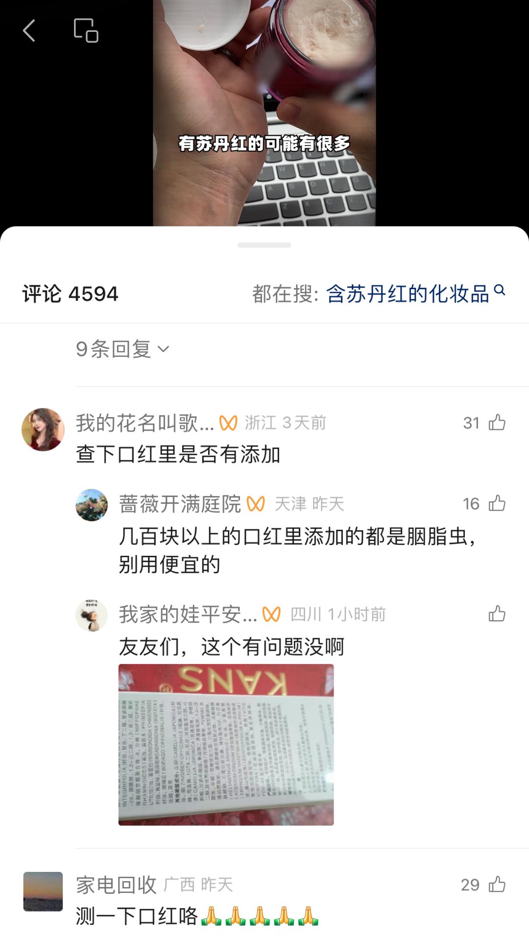 此外,比订单损失更迫切的,是消费者的健康焦虑。社交平台上,“连续使用3个月涉事面霜,担心肝脏受损”的分享引发共鸣;孕期、哺乳期女性消费者更是陷入恐慌,害怕苏丹红通过皮肤渗透影响胎儿或婴儿健康;敏感肌人群则担忧皮肤屏障受损加重,留下红肿、刺痛等后遗症。这些担忧并非空穴来风。目前,没有任何涉事品牌提供专业健康咨询服务,医院皮肤科也无明确针对“化妆品苏丹红接触”的检测项目,监管部门的官方健康指引更是尚未出台。消费者求助无门的状态,让焦虑从产品安全升级为维权无门,甚至有人直言“以后再也不敢随便买护肤品了”。行业信任的崩塌,往往就在这样的“无人负责”中加速。三、护肤品“色”险未平,彩妆色素安全再引热议当粉色、红色系护肤品因苏丹红一夜之间沦为“烫手山芋”,消费者对口红、腮红等彩妆产品的担忧也随之涌来。在老爸评测的视频评论区,不少人纷纷留言“求测评”:“口红有测吗?天天用口红,很怕也有苏丹红!”“能否看看口红里面有没有,口红颜色鲜艳,更需要色素,而且大家都会吃进去,太恐怖了。”“感觉口红和腮红更加需要检测!”