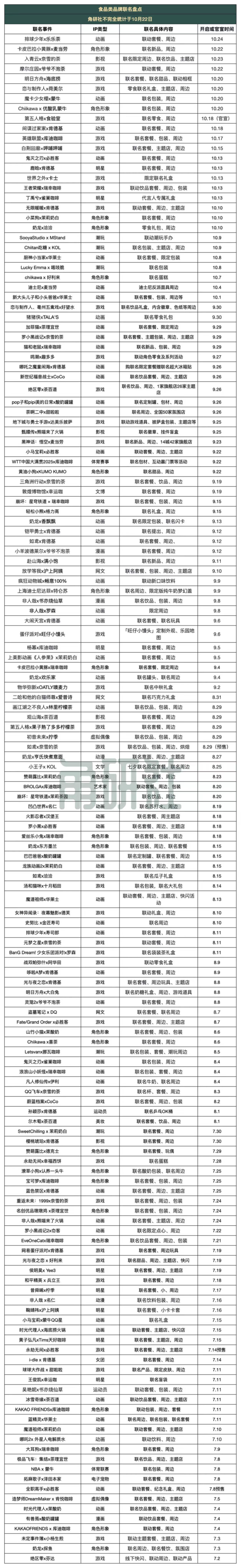 ACGN内容IP与食品的跨界联动越来越频繁。今年7月初,角研社盘点了上半年“IP+食品”的合作,如今近四个月过去,我们想看看在这个领域的跨界合作,有哪些新的合作和风向变化。