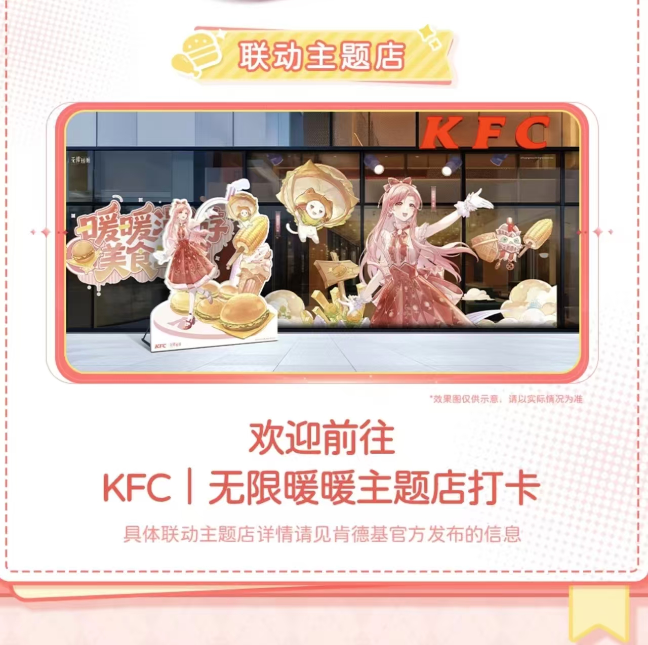 “肯德基”就是个很典型的例子,肯德基在中国大陆的门店总数已达12238家,覆盖超过2400个城市,门店数量也远远高于麦当劳。近段时间进行联名的IP有,“间谍过家家”、“无限暖暖”、“鹿晗”、“哪吒之魔童闹海”、“铠甲勇士”、“如鸢”、“大闹天宫”、“哆啦A梦”、“光与夜之恋”、“孙颖莎”、“樱桃琥珀”、“蓝色禁区”、“网易蛋仔派对”、“i-dle”、“造梦师DreamMaker ”等,IP类型有动画、游戏、明星、运动员、影视、女团、虚拟偶像。