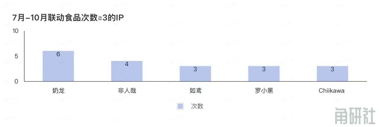 接下来是与食品品牌联名次数超过2次的IP,奶龙(6起)、非人哉(4起)、如鸢(3起)、罗小黑(3起)、Chiikawa (3起)。