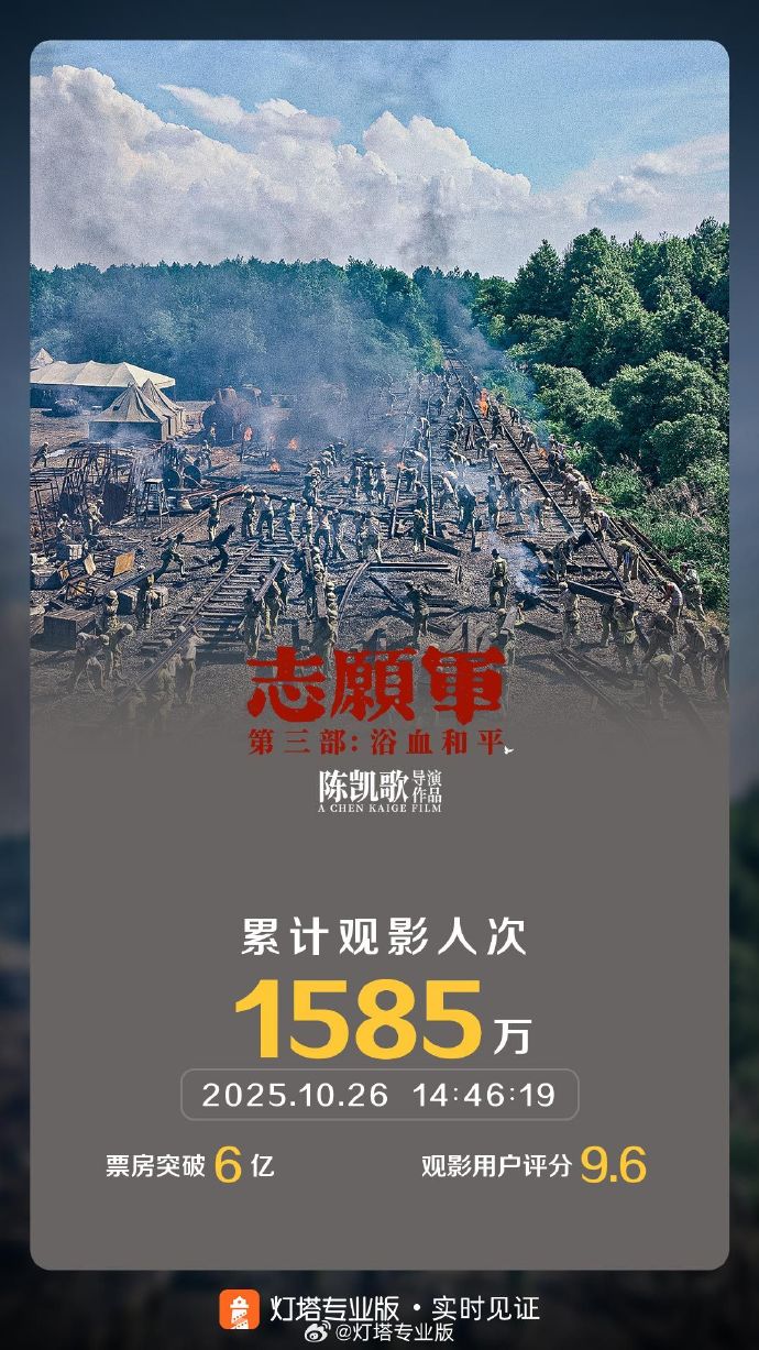 据灯塔专业版实时数据,截至10月26日14时46分,影片《志愿军:浴血和平》票房突破6亿。