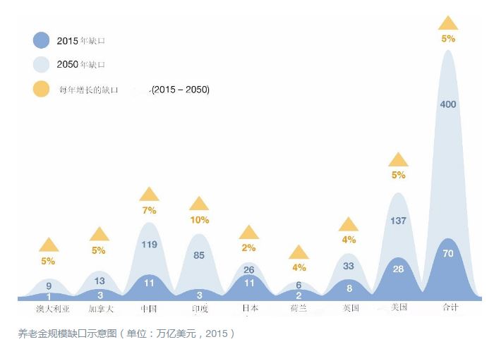 世界经济论坛一项新研究显示,到2050年,全球六大养老金储蓄国——美国、英国、日本、荷兰、加拿大和澳大利亚,面临的养老金缺口高达224万亿美元。计入中国和印度两个人口超级大国,养老金缺口预计达到400万亿美元,相当于目前全球经济总量的五倍。