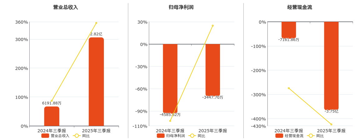 公司营业总收入为2.82亿元。归母净利润为-3447.70万元。经营活动现金净流入为-3.75亿元,较去年同报告期经营活动现金净流入减少3.04亿元。