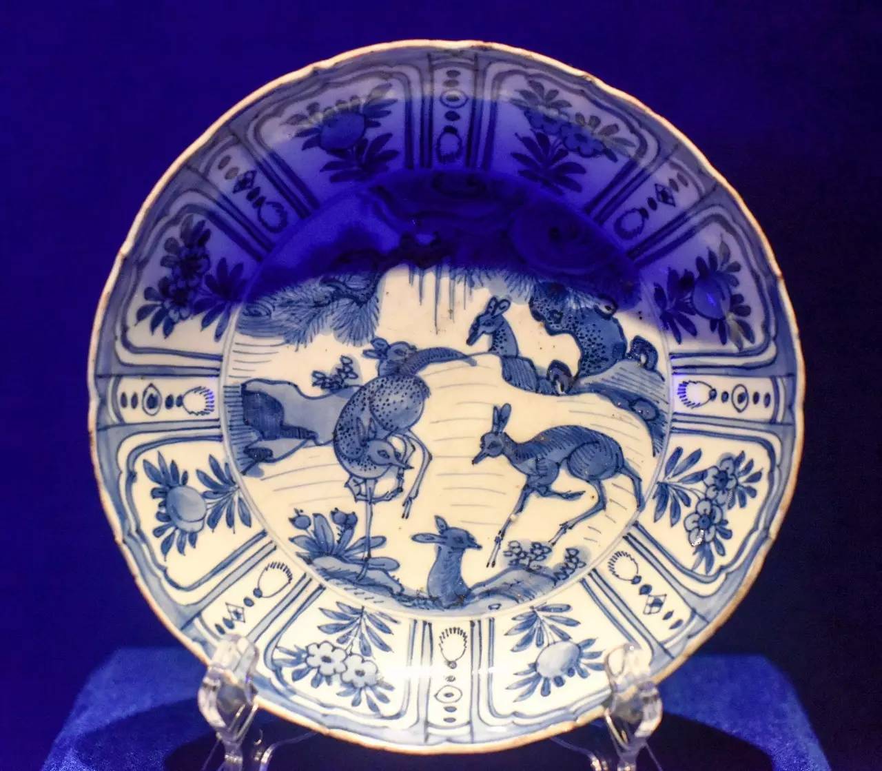 明万历 克拉克瓷青花开光花卉松鹿纹盘