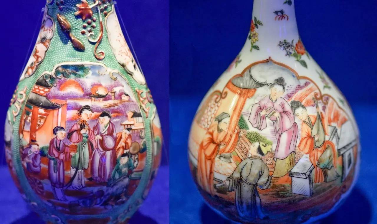 (左)清乾隆 广彩绿地开光人物图海棠式瓶/(右)清道光 广彩开光人物图胆瓶