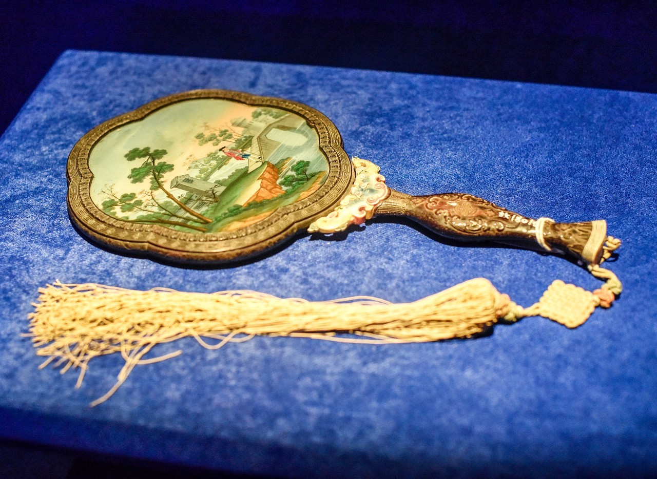 镜子背面采用西方玻璃画装饰工艺制作而成,图案题材却是一派中国风。