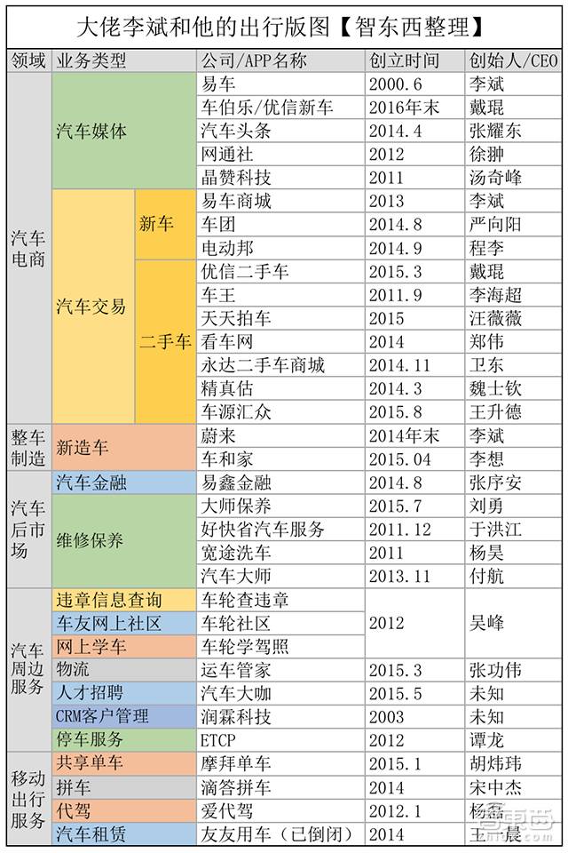 李斌也将这份情商用在了构筑其出行版图之上。在李斌投资的众多公司中,还有一支特别的“易车系”,这些公司创始人有一个共同身份——前易车员工。这个队伍包括了前易车副总裁、现优信CEO戴琨,前易车副总裁、精真估创始人魏士钦,前易车副总裁兼优卡二手车总经理、现车源汇众CEO王升德,前易车新意互动前策略部总经理、百车宝创始人付航。