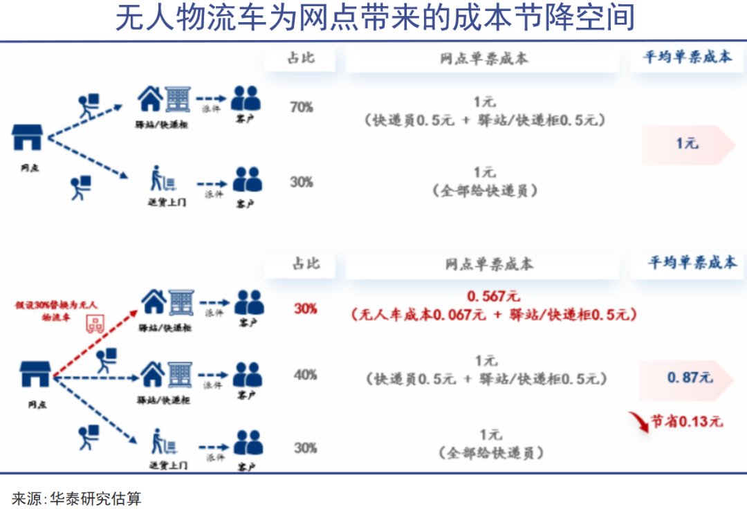 有券商测算过,有人车单票运输成本为0.16元,若使用无人车,快递单票运输成本可降至0.05元,可以省去0.11元/票,进一步压缩末端成本,降本空间69%。