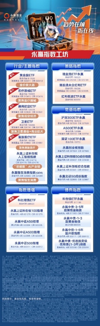 风险提示:基金有风险,投资需谨慎。基金管理人承诺以诚实信用、勤勉尽责的原则管理和运用基金资产,但不保证本基金一定盈利,也不保证最低收益。基金的过往规模、业绩及其净值高低并不预示其未来业绩表现,基金管理人管理的其他基金的业绩并不构成对本基金业绩表现的保证。投资不同类型的基金将获得不同的收益预期,并承担不同程度的风险。通常基金的收益预期越高,风险越大。永赢中证A50指增、永赢中证500指增属于中风险(R3)产品,适合经客户风险承受能力等级测评后结果为平衡型(C3)及以上的投资者。黄金股ETF、通用航空ETF、卫星ETF、永赢上证科创板100指增属于中高风险(R4)产品,适合经客户风险承受能力等级测评后结果为成长型(C4)及以上的投资者。基金风险等级与投资者风险承受能力等级对照表详见永赢基金官网。投资者通过代销机构提交交易申请时,应以代销机构的风险评级规则为准。黄金股ETF、永赢中证A50指数增强、永赢上证科创板100指数增强、永赢中证500指数增强可投资港股通标的股票,除了需要承担与境内证券投资基金类似的市场波动风险等一般投资风险之外,还面临汇率风险等境外证券市场投资所面临的特别投资风险。敬请投资者在做出投资决策之前,仔细阅读产品法律文件,充分认识本基金的风险收益特征和产品特性,充分考虑自身的风险承受能力,理性判断并谨慎做出投资决策。