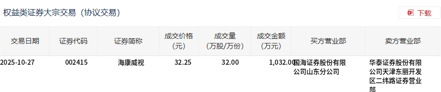 10月27日,海康威视大宗交易成交32万股,成交额1032万元,占当日总成交额的0.32%,成交价32.25元,较市场收盘价33.9元折价4.87%。