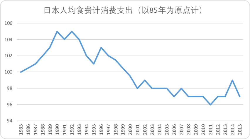 长期以来,受食材自给率低下、人工成本偏高的影响,日本餐饮消费的价格相对较贵,外出就餐的成本自然也高。原本经济的繁荣让居民普遍乐观,他们不在意这部分支出,就连奢侈品消费也空前膨胀。但自从进入“失去的三十年”,日本的人均收入开始逐渐下滑,和所有消费品一样,餐饮客单价在泡沫破裂后也悄悄“缩水”。