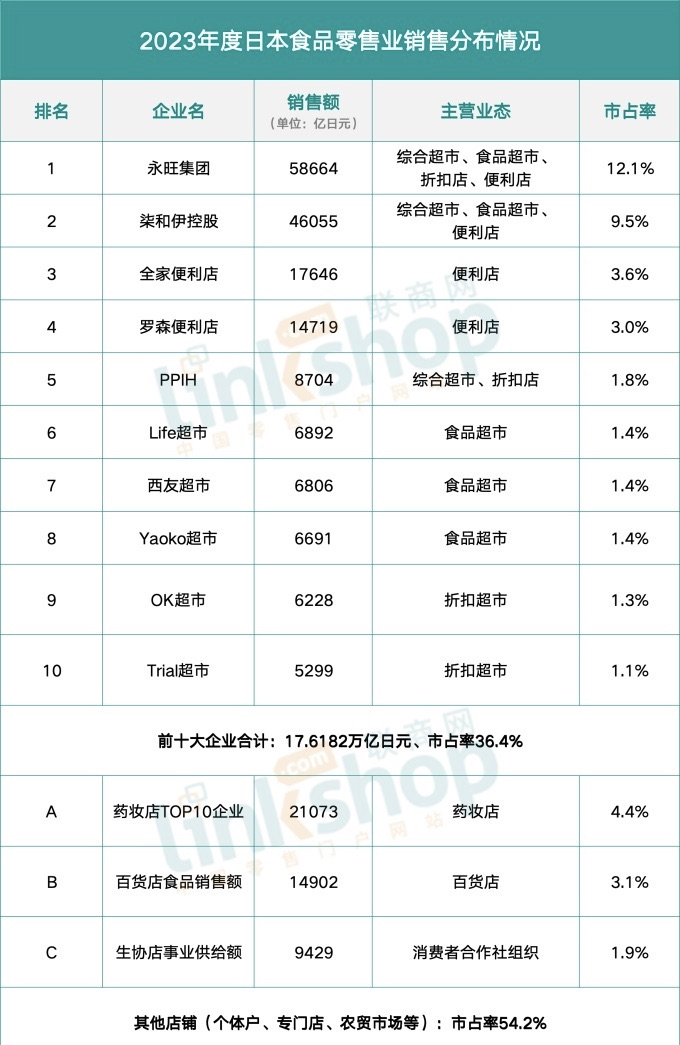 根据日本经济产业省的《商业动态统计》显示,2023年度日本食品零售业的商品销售总额为48.3790万亿日元,其中,“便利店”销售额为12.7320万亿日元,同比增长4.4%,三大连锁便利店品牌合计占据食品零售总体14.2%的市场份额。可是,药妆店增势凶猛,药妆店前十大企业的食品销售总额达到2.1073万亿日元,较上年度增长23.1%。