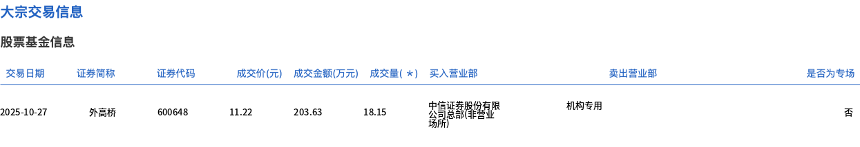 10月27日,外高桥大宗交易成交18.15万股,成交额203.63万元,占当日总成交额的2.51%,成交价11.22元,较市场收盘价11.22元持平。