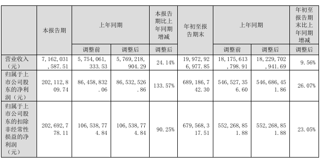 据财报内容,年初至三季度末,公司实现营业收入199.73亿元,同比增长9.56%;归母净利润为6.89亿元,同比增长26.07%;扣非归母净利润为6.80亿元,较上年同期增长23.05%。