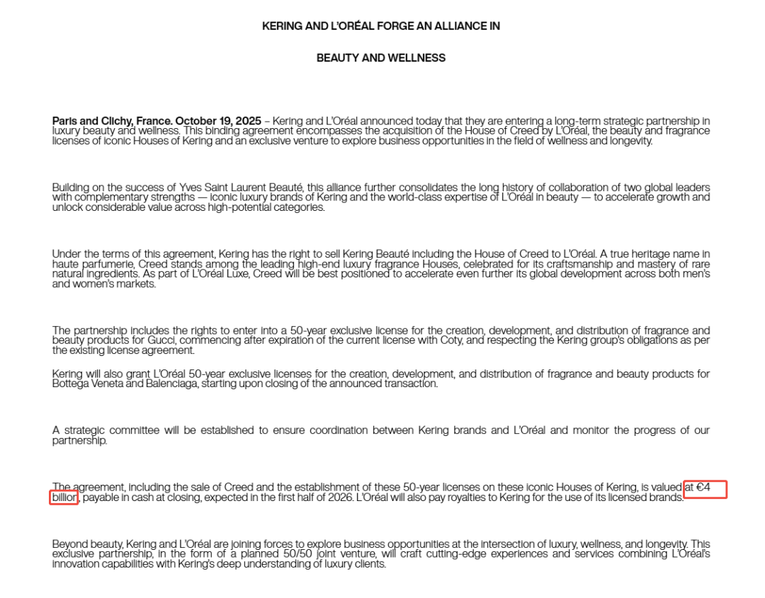 据欧莱雅官方公告显示,欧莱雅与开云集团将在高端美妆和健康领域建立长期战略合作伙伴关系,协议总价值达40亿欧元(约合人民币333亿元)。该金额将在交易完成时将以现金支付,预计于2026年上半年完成交割。此外,欧莱雅还将向开云集团支付使用其许可品牌的特许使用费。