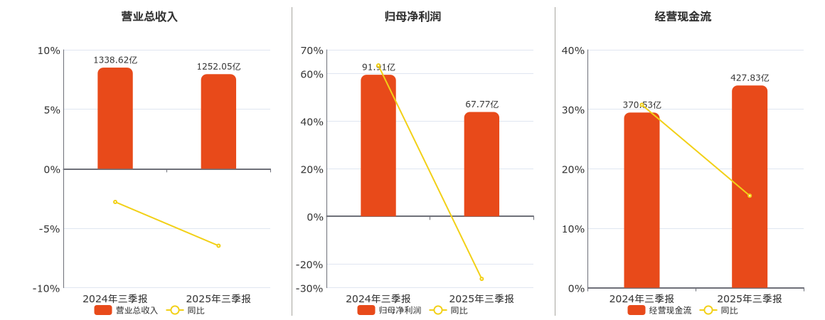 公司营业总收入为1252.05亿元,较去年同报告期营业总收入减少86.57亿元,同比较去年同期下降6.47%。归母净利润为67.77亿元,较去年同报告期归母净利润减少24.14亿元,同比较去年同期下降26.27%。经营活动现金净流入为427.83亿元,较去年同报告期经营活动现金净流入增加57.30亿元,实现2年连续上涨,同比较去年同期上涨15.47%。