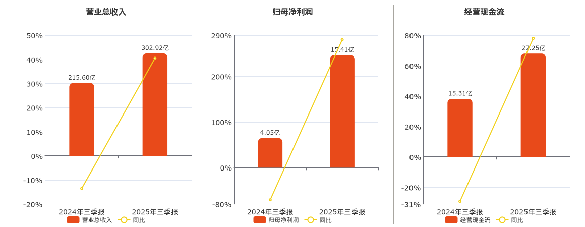 公司营业总收入为302.92亿元,在已披露的同业公司中排名第3,较去年同报告期营业总收入增加87.32亿元,同比较去年同期上涨40.50%。归母净利润为15.41亿元,在已披露的同业公司中排名第3,较去年同报告期归母净利润增加11.36亿元,同比较去年同期上涨280.27%。经营活动现金净流入为27.25亿元,在已披露的同业公司中排名第2,较去年同报告期经营活动现金净流入增加11.94亿元,同比较去年同期上涨77.98%。