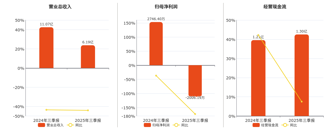 公司营业总收入为6.19亿元,较去年同报告期营业总收入减少4.88亿元,同比较去年同期下降44.12%。归母净利润为-2006.19万元,较去年同报告期归母净利润减少4752.60万元,同比较去年同期下降173.05%。经营活动现金净流入为1.30亿元,较去年同报告期经营活动现金净流入增加905.17万元,实现5年连续上涨,同比较去年同期上涨7.47%。