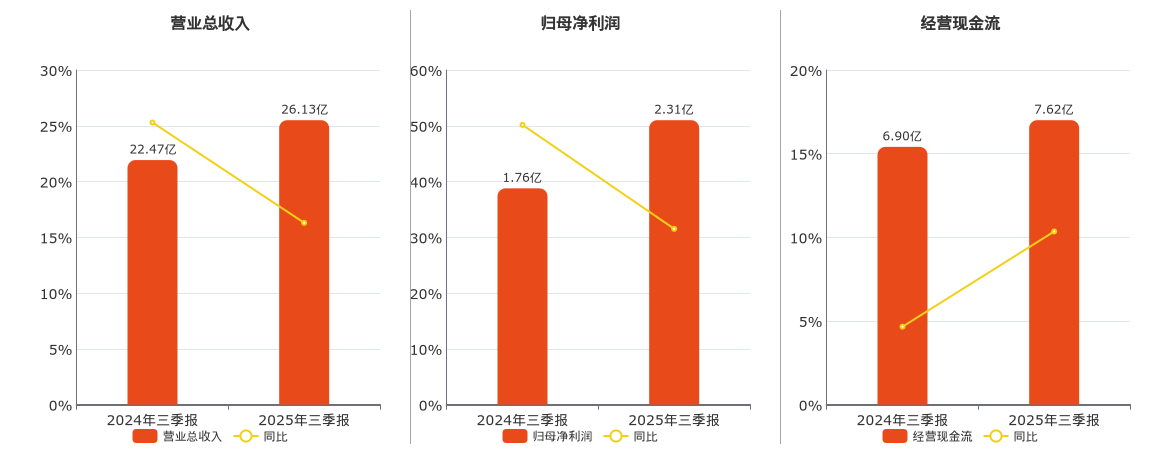 公司营业总收入为26.13亿元。归母净利润为2.31亿元。经营活动现金净流入为7.62亿元。