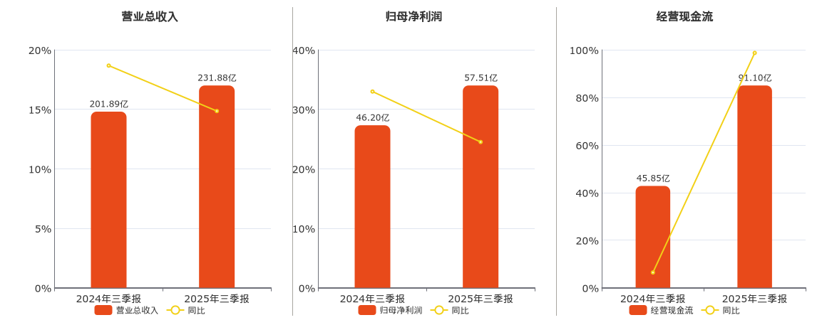 公司营业总收入为231.88亿元。归母净利润为57.51亿元。经营活动现金净流入为91.10亿元。