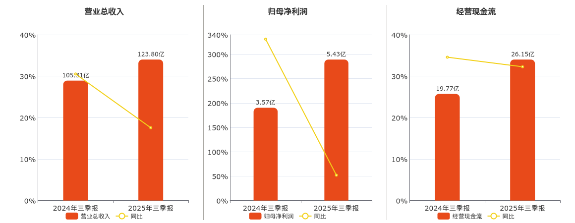 公司营业总收入为123.80亿元。归母净利润为5.43亿元。经营活动现金净流入为26.15亿元。