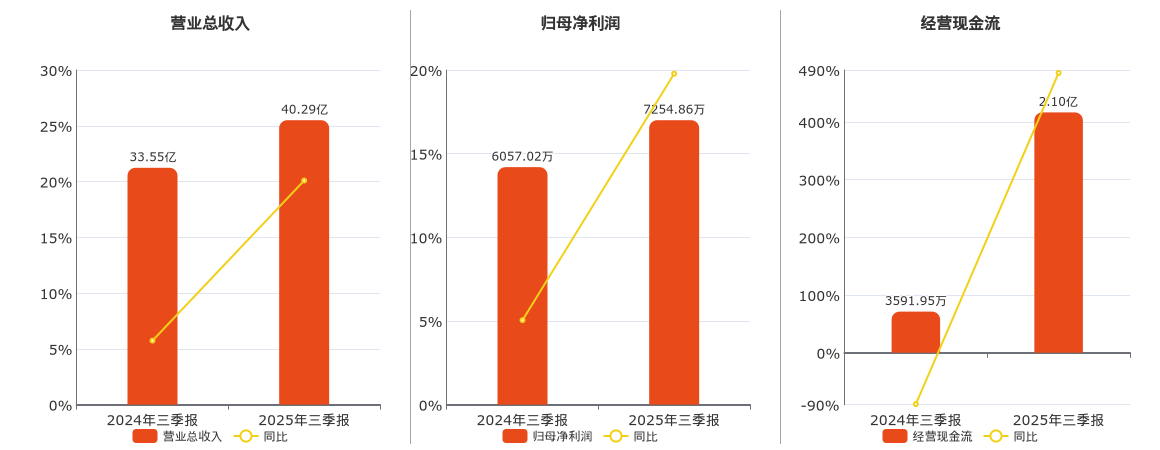 公司营业总收入为40.29亿元。归母净利润为7254.86万元。经营活动现金净流入为2.10亿元。