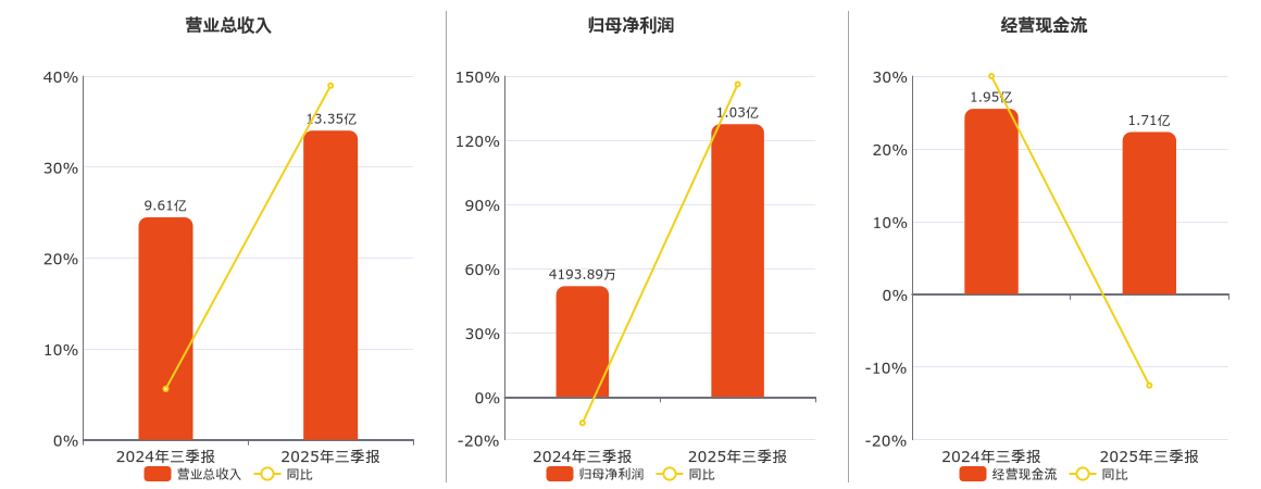 公司营业总收入为13.35亿元。归母净利润为1.03亿元。经营活动现金净流入为1.71亿元,较去年同报告期经营活动现金净流入减少2444.79万元,同比较去年同期下降12.53%。