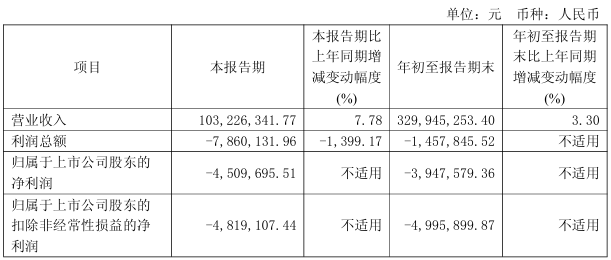 从营收表现来看,公司第三季度及前三季度均实现同比增长,展现出一定经营韧性。财报披露,本报告期内,公司营业收入达1.03亿元,同比增长7.78%;年初至报告期末营收规模进一步扩大至3.30亿元,同比增长3.30%。